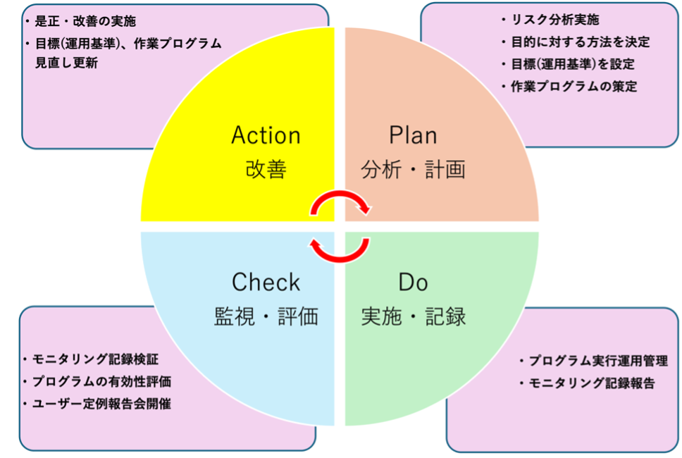 貴社の食品安全の衛生環境課題を解決するために、「HACCP方式改善プログラム」の実践と、「PDCAマネジメントシステム」の運用による継続的改善を構築サポートします。